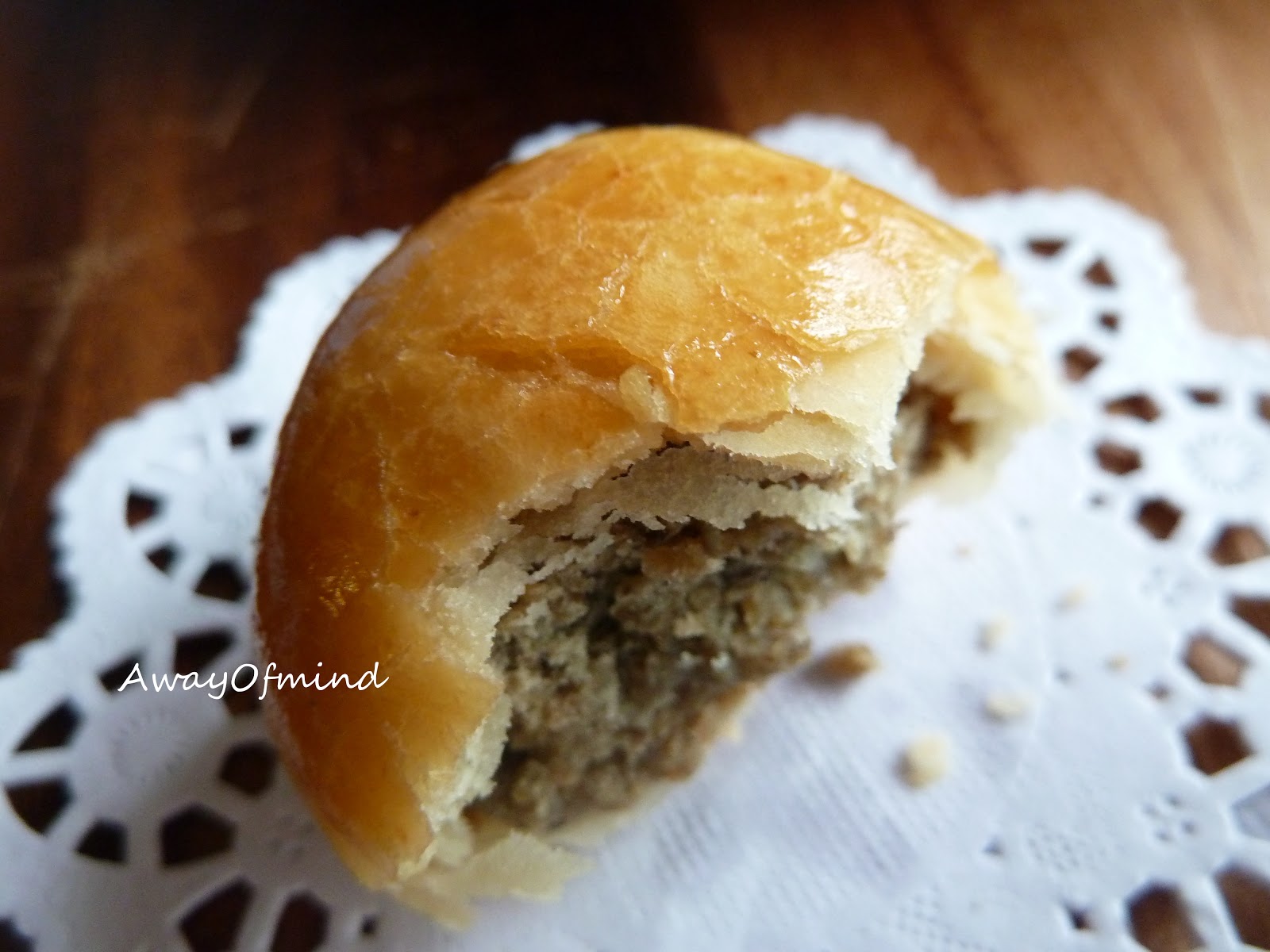 After baking my first Siew Pow, I've more confidence in baking my own Tau Sar Piah. I refered to Jane's Corner and My Kitchen Snippets recipes and found that they have some differences in the ingredients, Jane used peeled mung beans and Gertrude used dried mung beans and vineger, both creations were beautifully done. At the end I used Gertrude, My Kitchen Snippets recipe because she didn't use shortening. However, as I don't have dried mung beans, I used mung beans and ...that's really lot of time in preparing the filling, it took me nearly 4 hours in the kitchen just to make these Tau Sar Piah, while two boys rushed me to go picnic with them in West Coast Park! I think this is a good excuse why I forgot to peel the mung beans :) My filling end up in frightening....grey greenish.